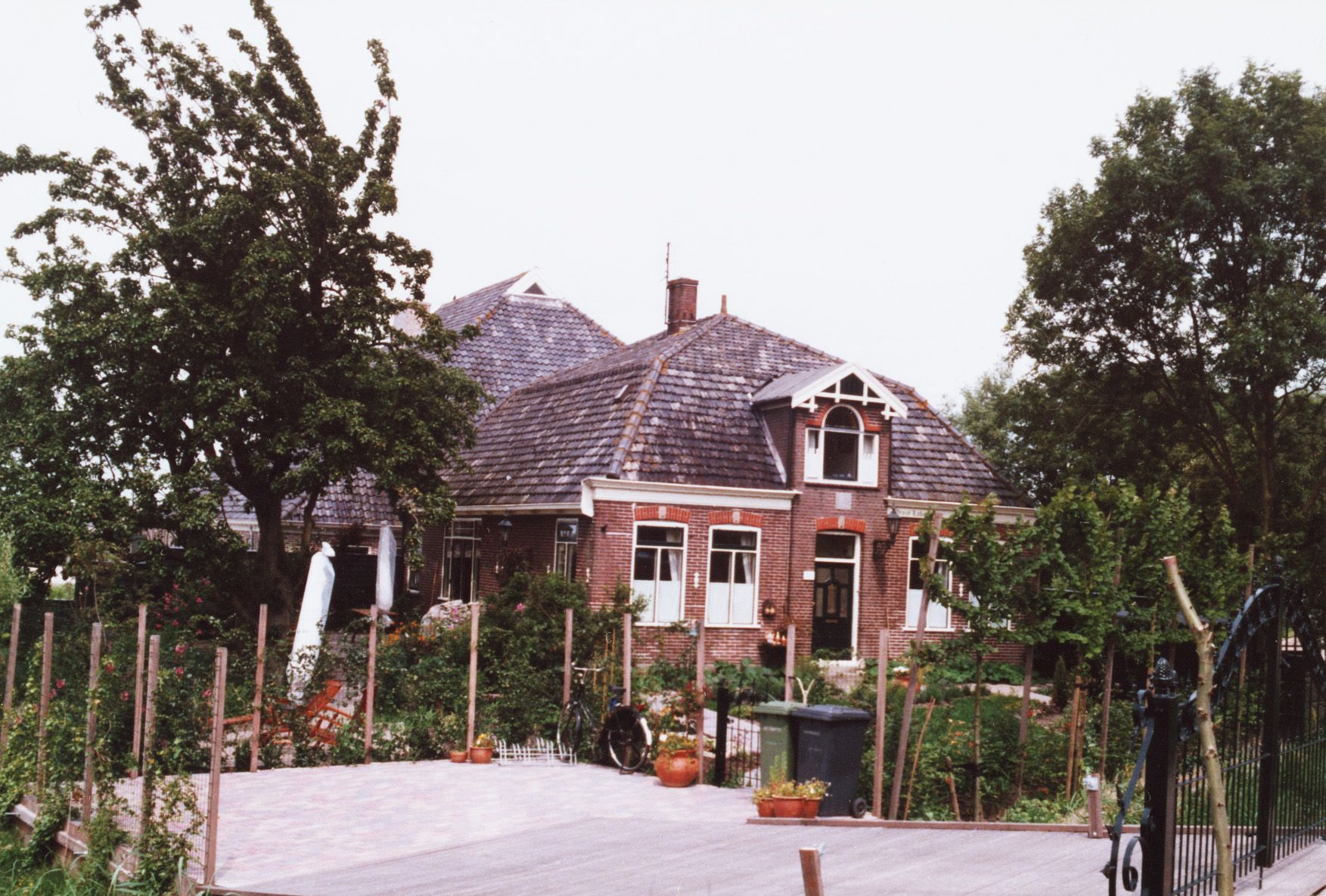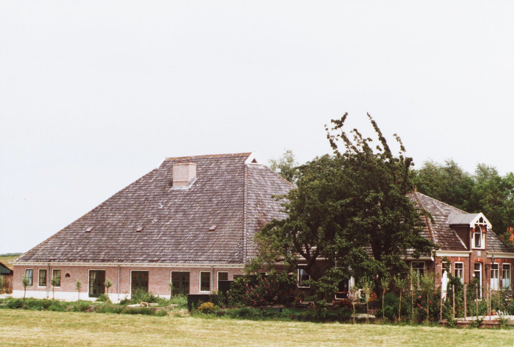 In 1998 opnieuw opgetrokken met bestaand dubbel vierkant met aangebouwd voorhuis. Siermetselwerk. Puntige dakvorst.